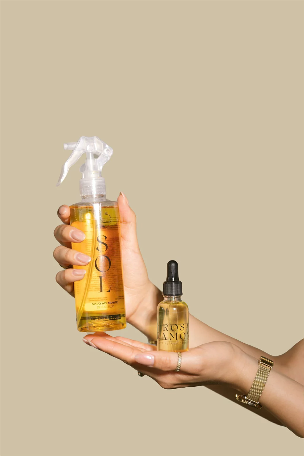 Sol: nuestro aclarante capilar estrella, con fórmula de química verde, que aclara progresivamente el cabello mientras lo mantiene suave y manejable. Ideal para lograr un look iluminado y natural sin maltratar tu melena.